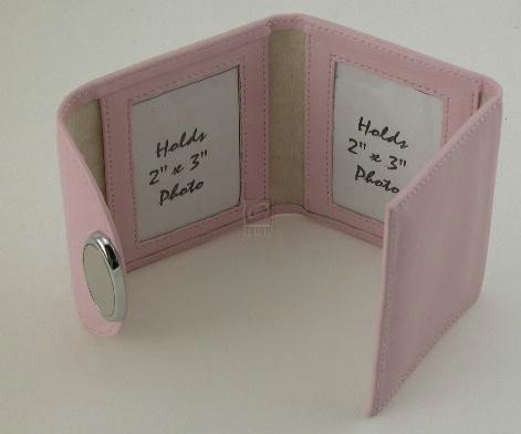 PINK TRI-FOLD FRAME, HOLDS 3, 2" X 3" PHOTOS.